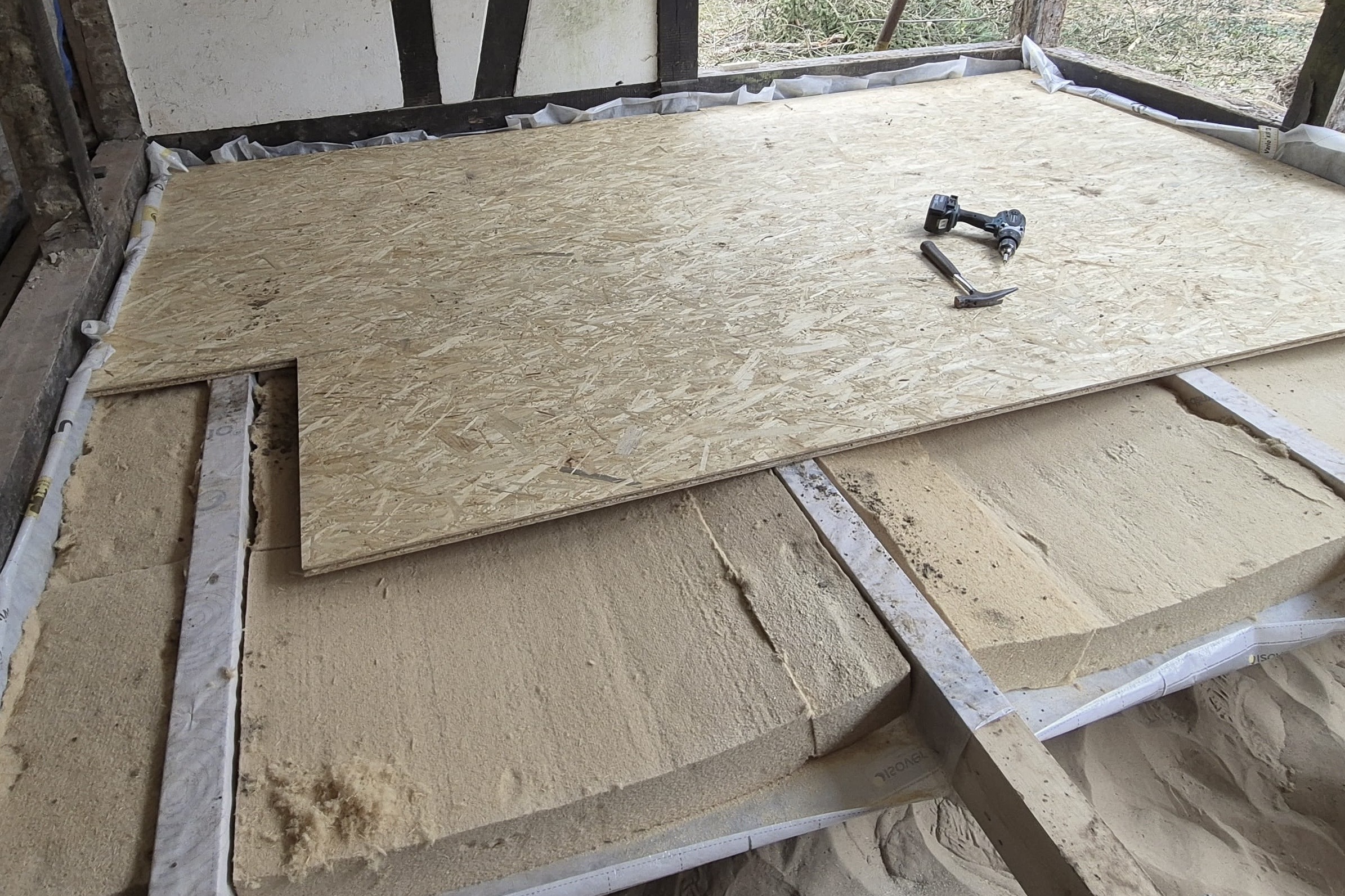 Die Fußbodenbalkenlage wurde erneuert und zusätzlich gedämmt. Dadurch wurde eine einheitliche Fläche geschaffen, auf die weiteraufgebaut werden kann.
